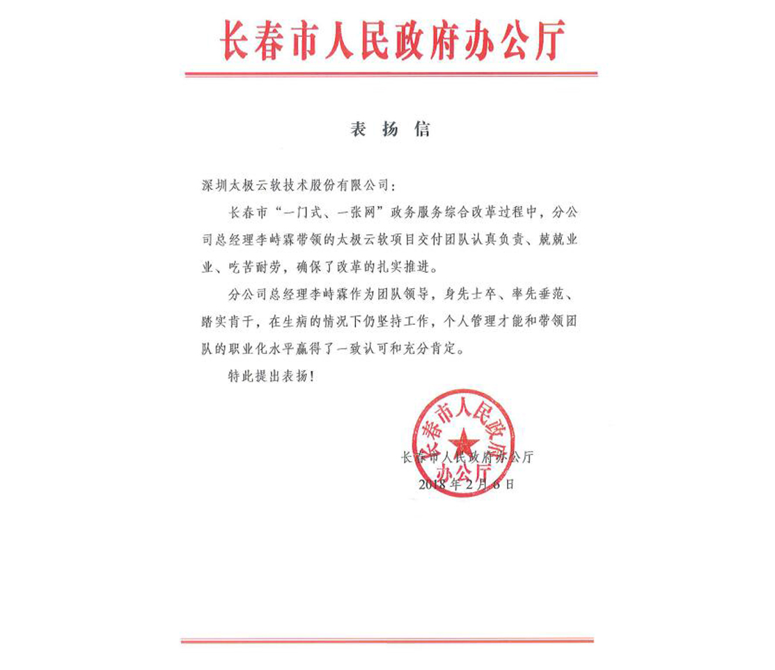今天,公司收到長春市政府辦公廳用特快專遞送來的表揚信。表揚信說: “長春市一門式、一張網政務服務綜合改革過程中,分公司總經理李峙霖帶領的太極云軟項目交付團隊認真負責、兢兢業(yè)業(yè)、吃苦耐勞,確保了改革的扎實推進。 分公司總經理李…